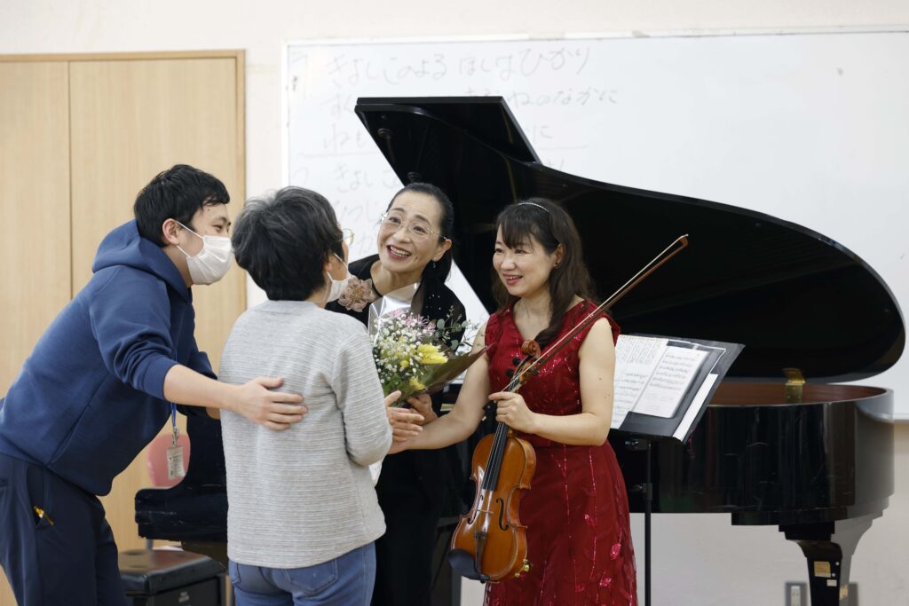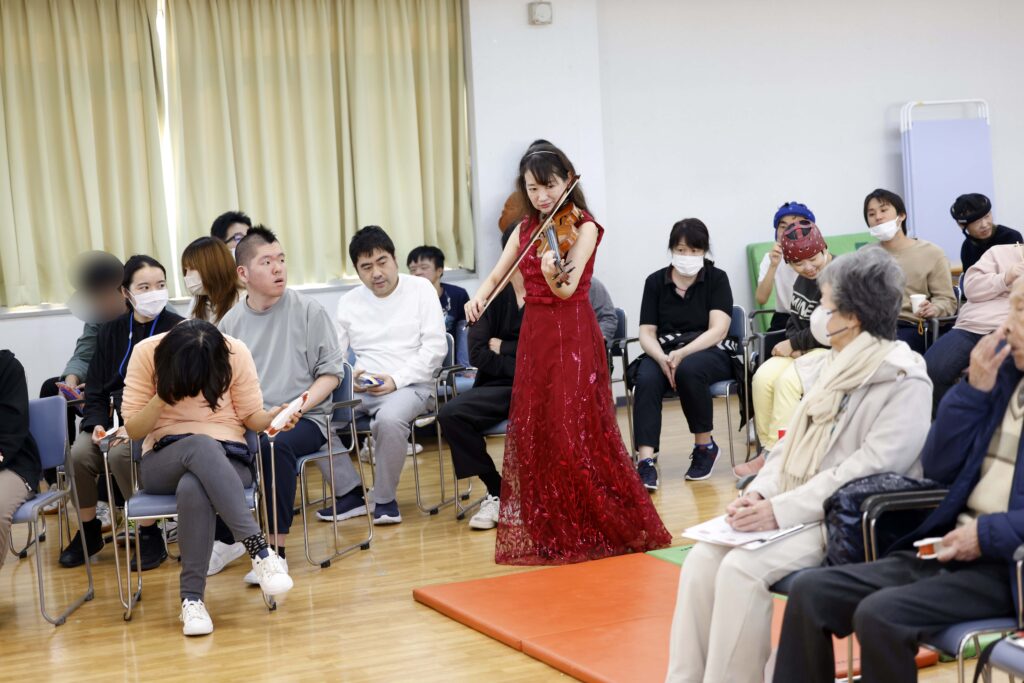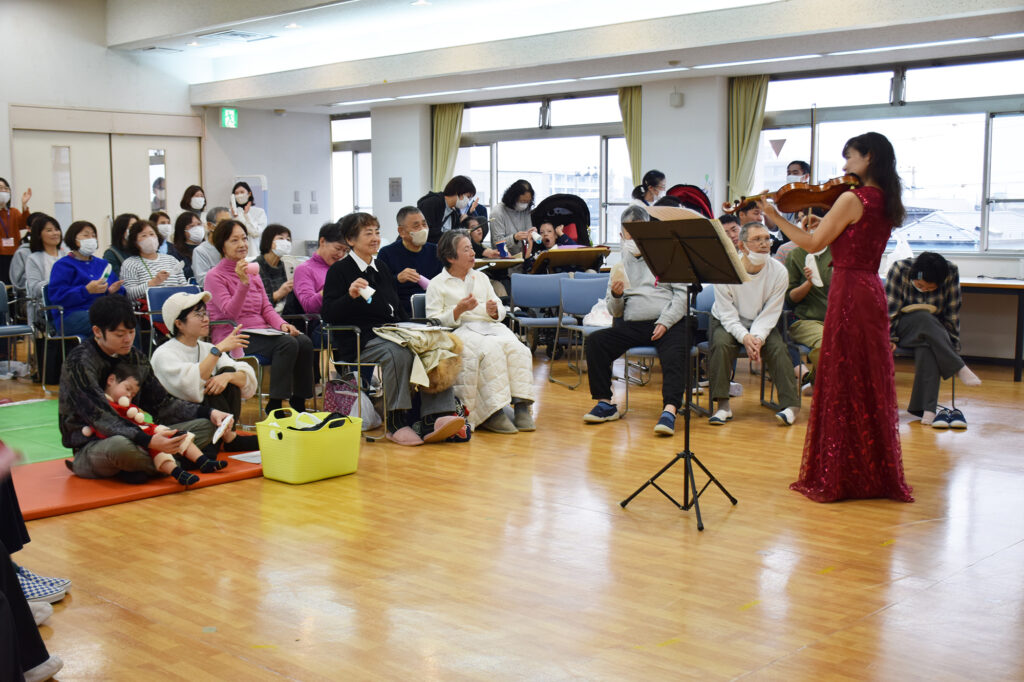 プログラムの途中にはヴァイオリニストの石塚さんがステージ側から観客席まで移動し、参加者に囲まれながらより近距離でヴァイオリン演奏を披露する場面もありました。